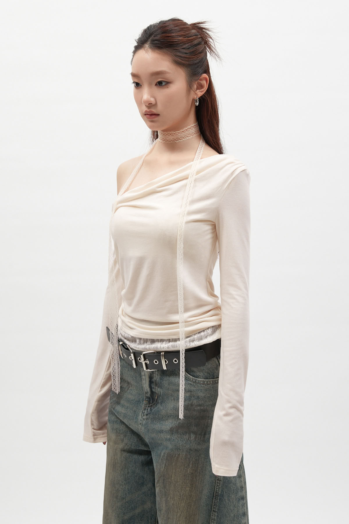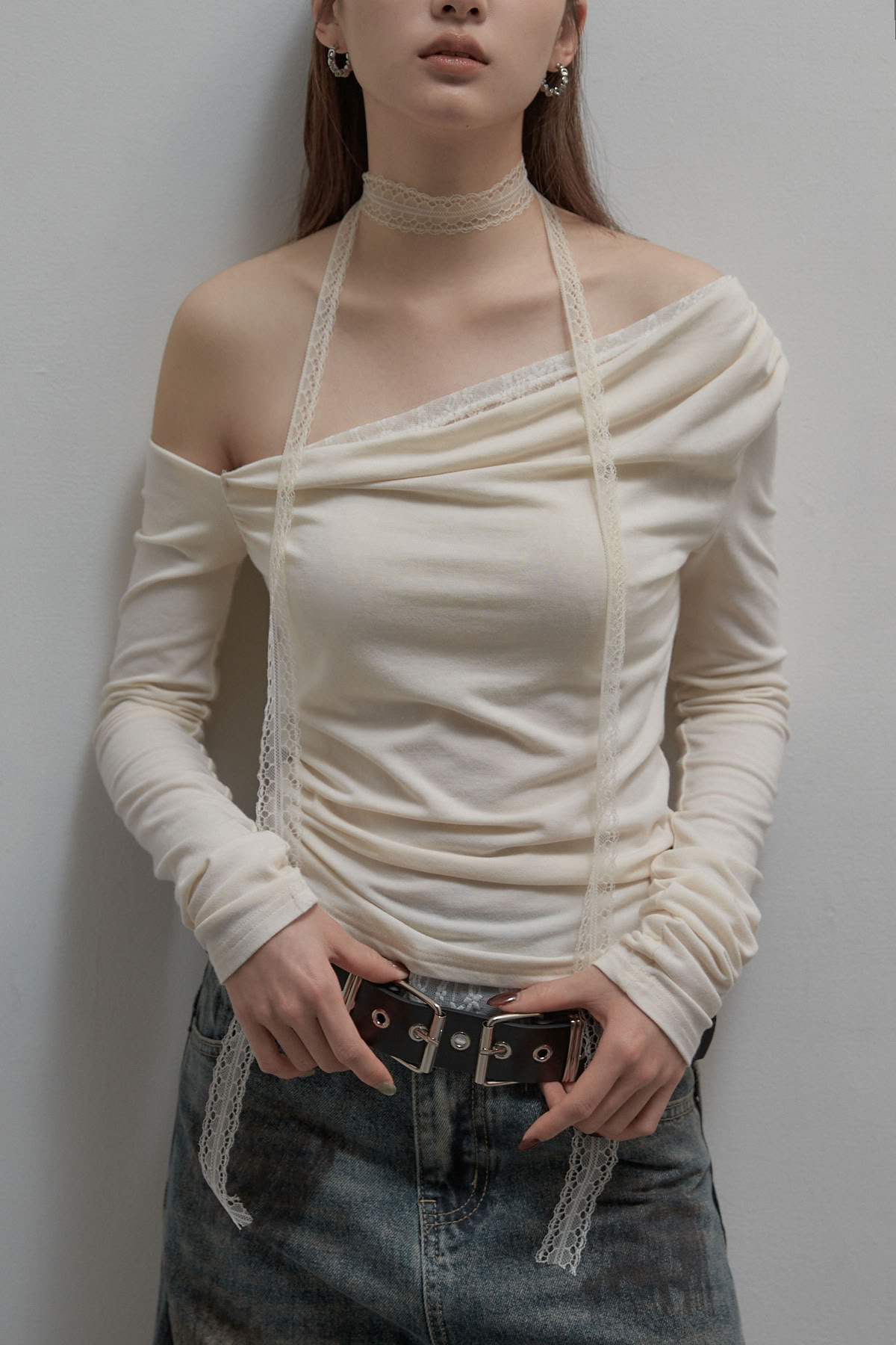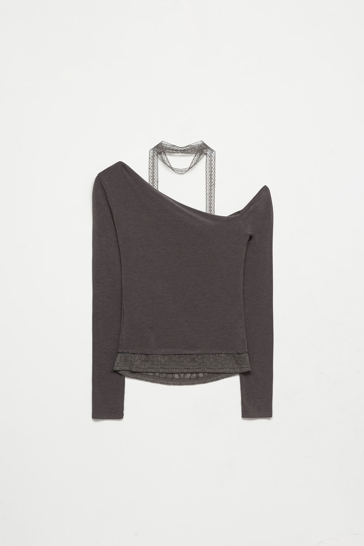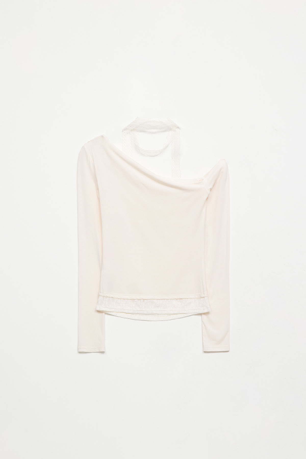 蕾絲圍脖拼接斜肩長袖上衣