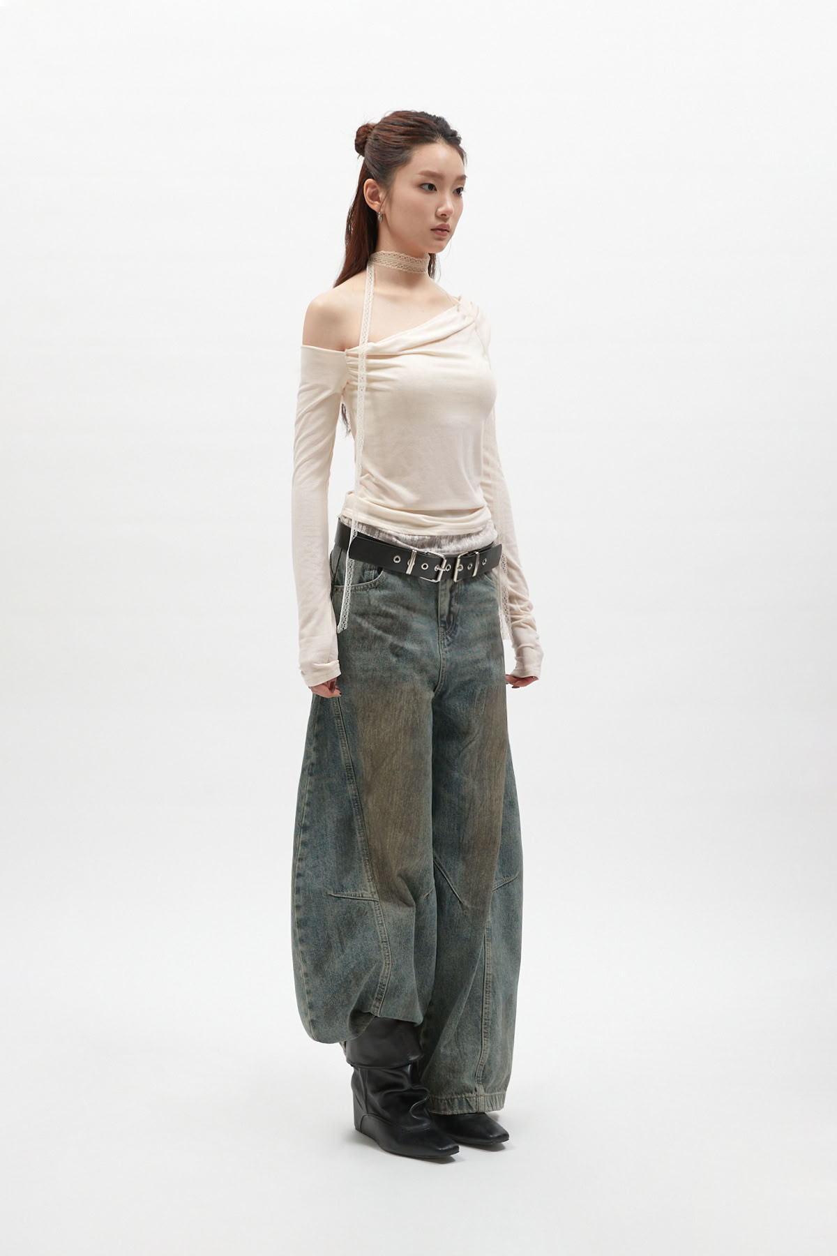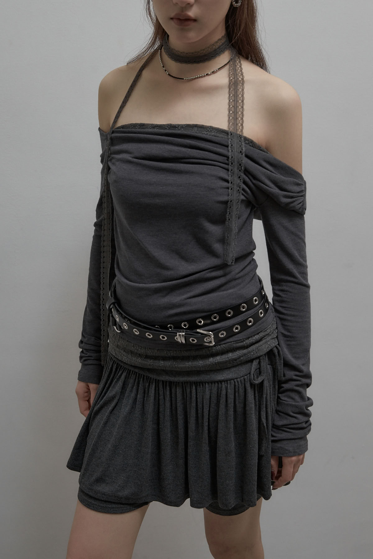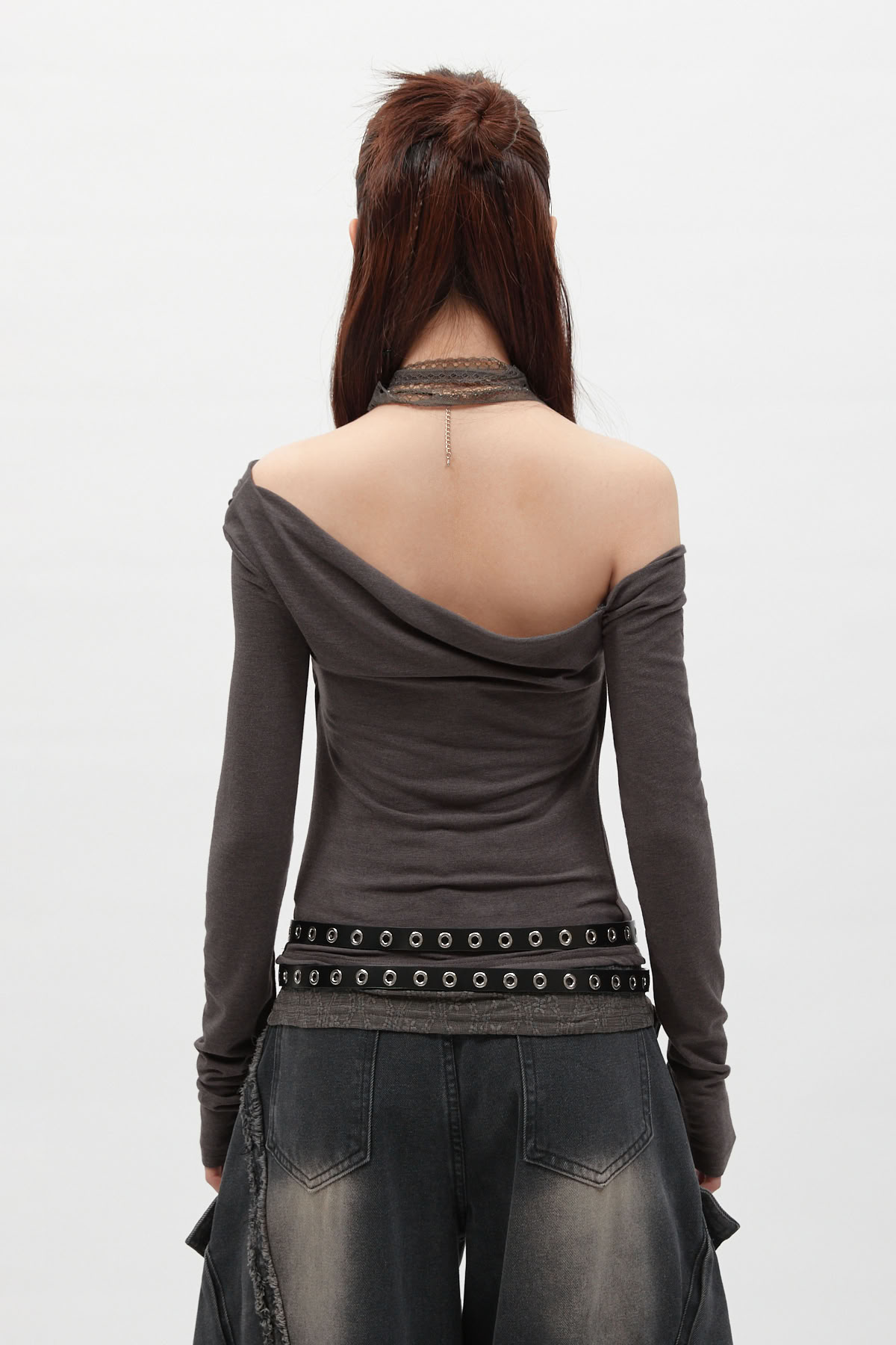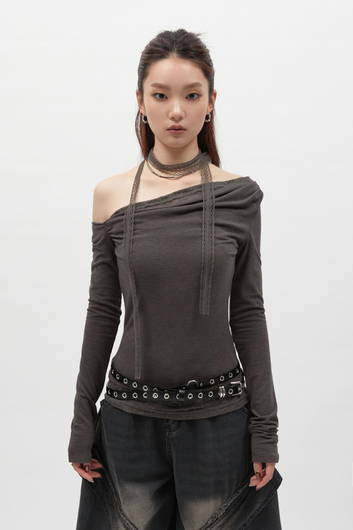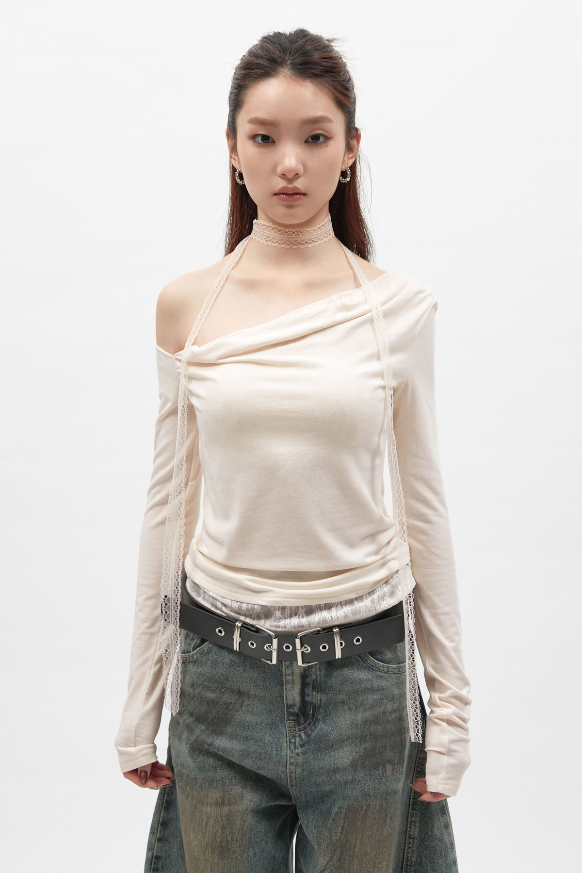 蕾絲圍脖拼接斜肩長袖上衣