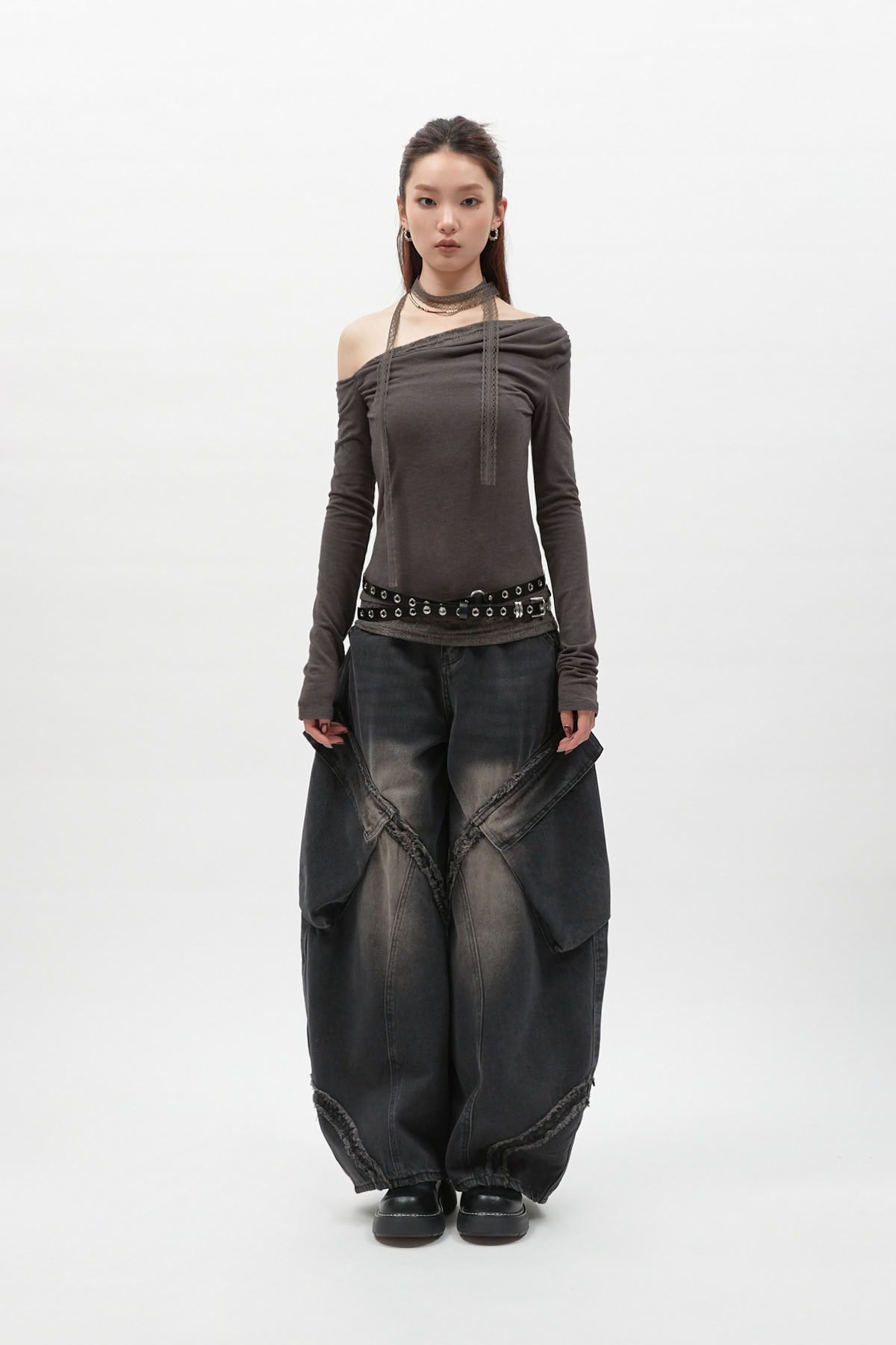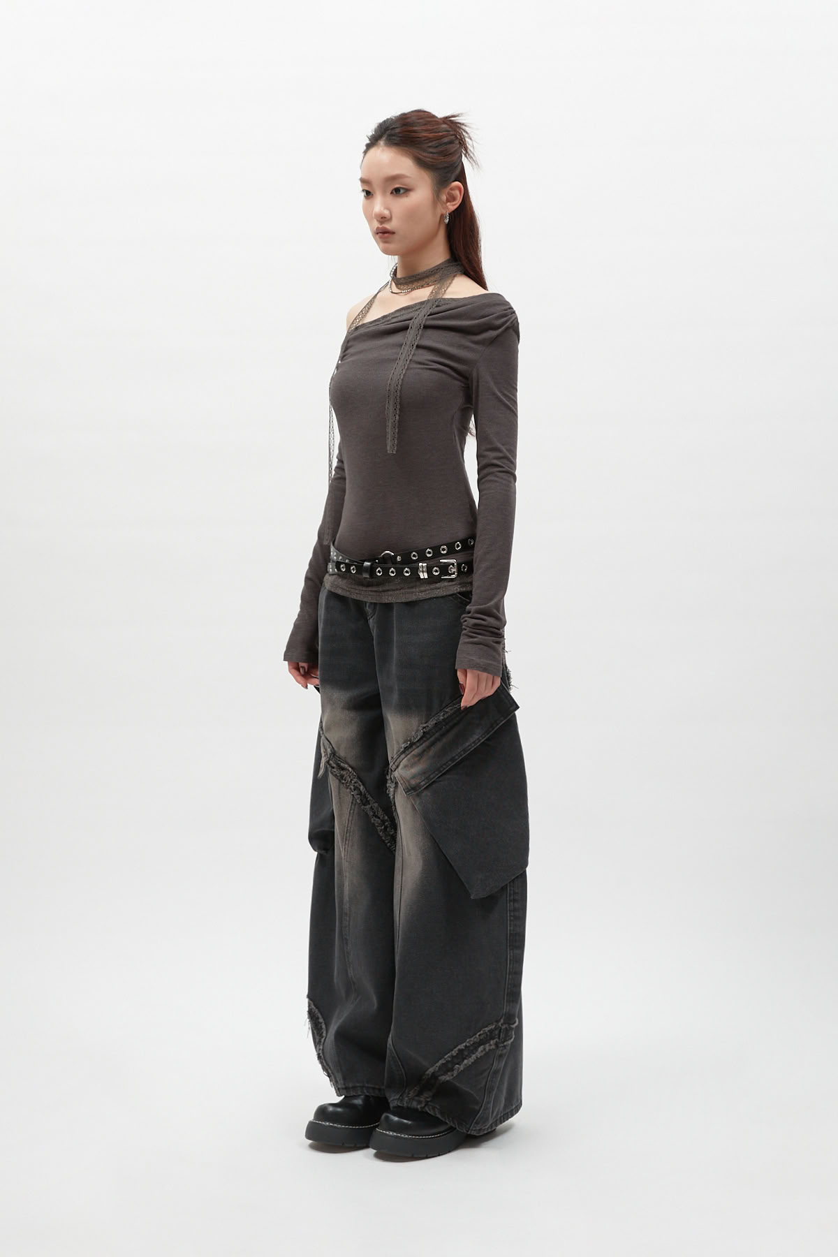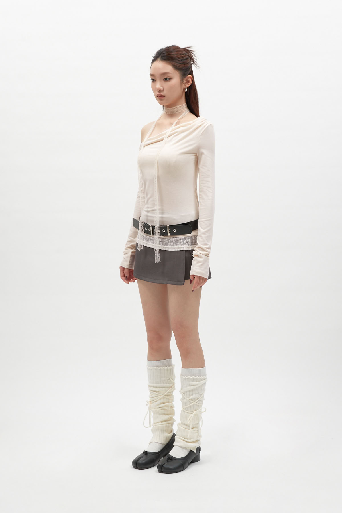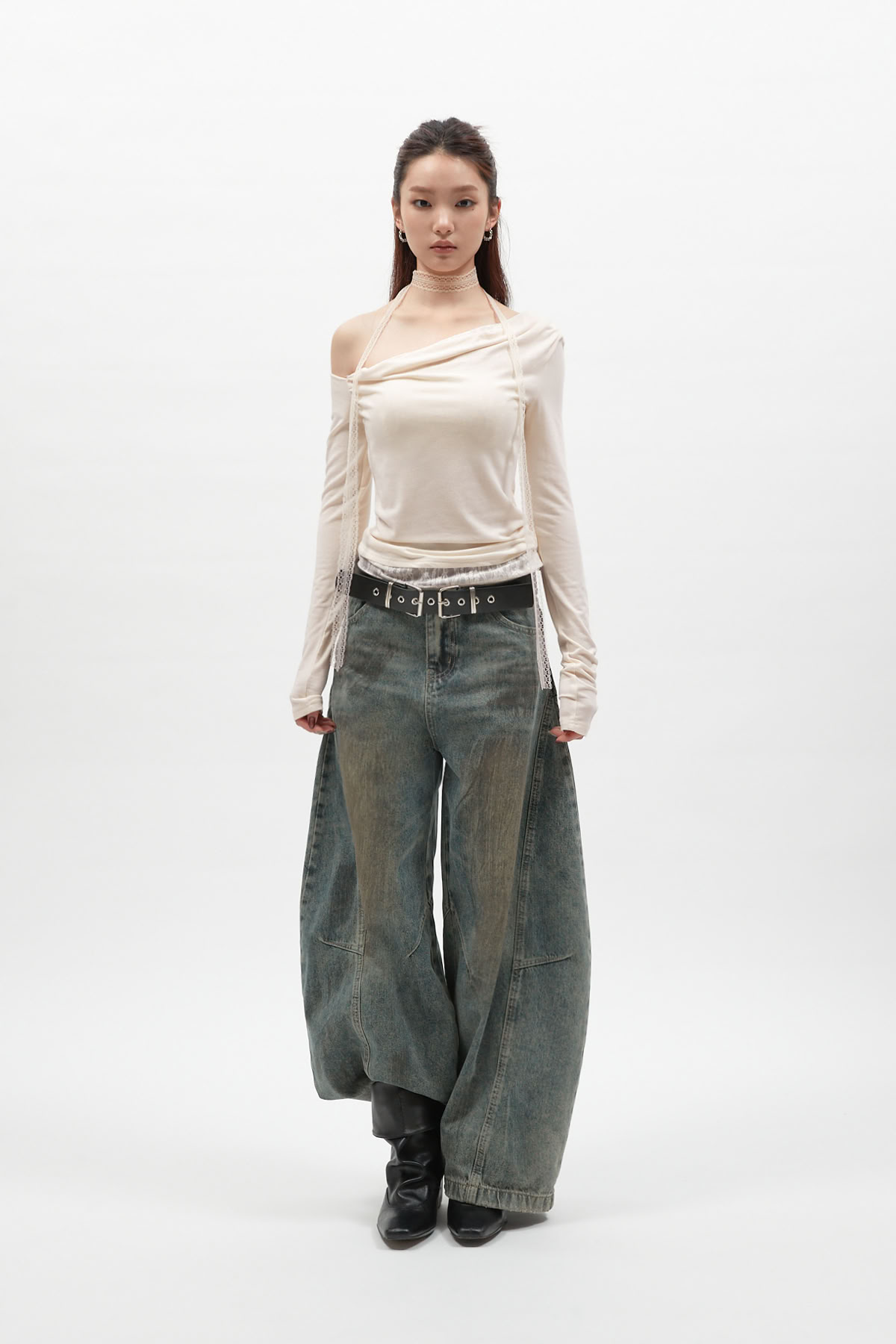 蕾絲圍脖拼接斜肩長袖上衣