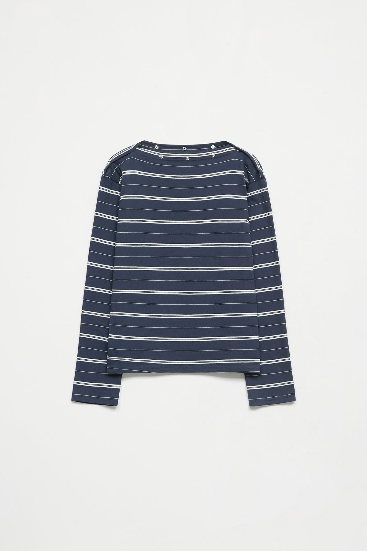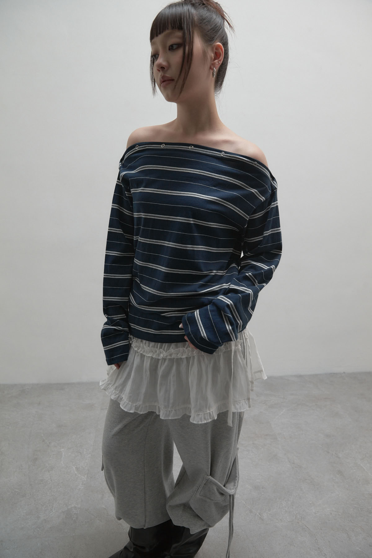 鉚釘條紋斜肩長袖上衣